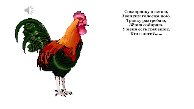 Спозаранку я встаю, Звонким голосом пою. Травку разгребаю, Зёрна собираю. У меня есть гребешок, Кто я дети?……