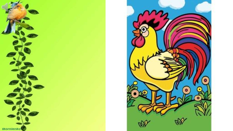Слайд 2Спозаранку я встаю, Звонким голосом пою. Травку разгребаю, Зёрна собираю. У меня есть гребешок, Кто