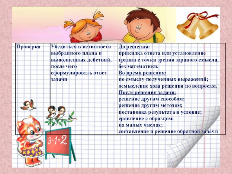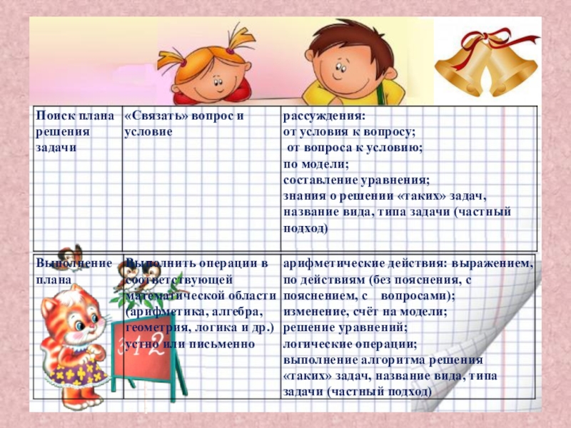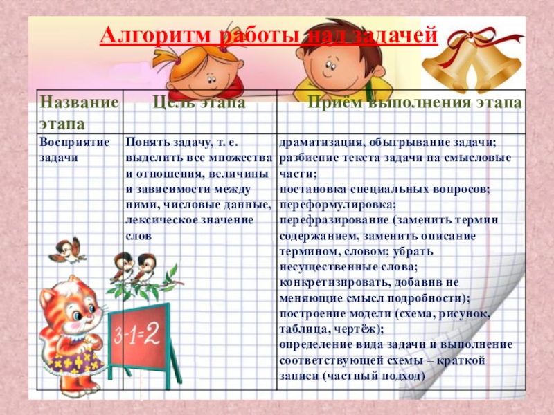 определять, является ли предложенный текст задачей, при этом выделяя в нем основные признаки этого вида заданий и его составные элементы и устанавливая между ними связи;