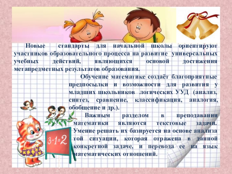 Обучение математике создаёт благоприятные предпосылки и возможности для развития у младших школьников логических УУД (анализ, синтез, сравнение, классификация, аналогия, обобщение и др.).