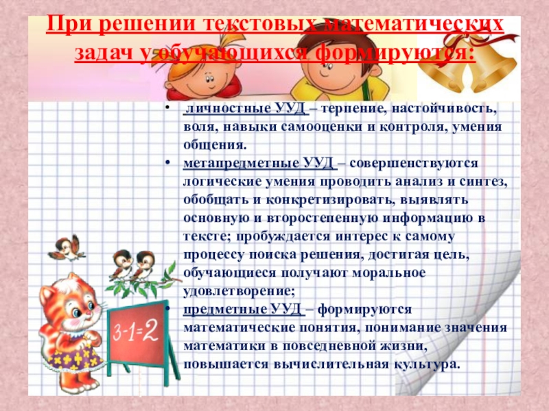 Слайд 3При решении текстовых математических задач у обучающихся формируются: