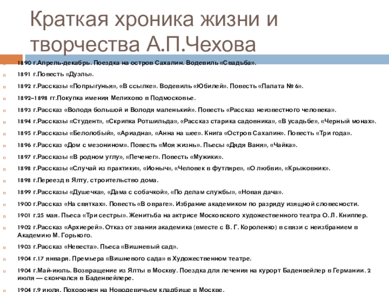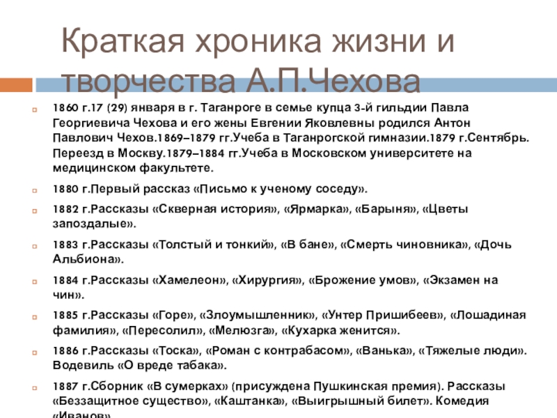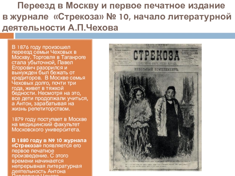 В 1880 году в N9 10 журнала «Стрекоза» появляется его первое печатное произведение. С этого времени начинается непрерывная литературная деятельность Антона Павловича Чехова