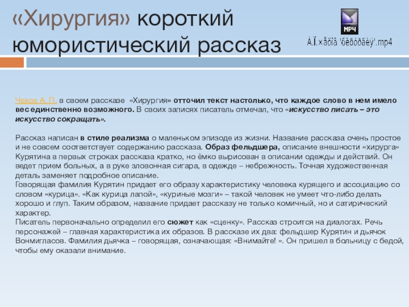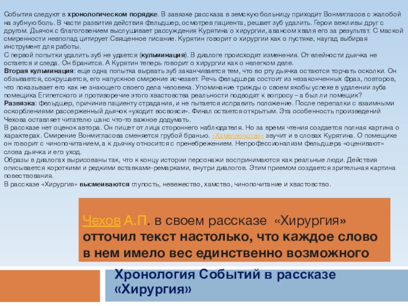 В рассказе «Хирургия» высмеиваются глупость, невежество, хамство, чинопочитание и хвастовство.
