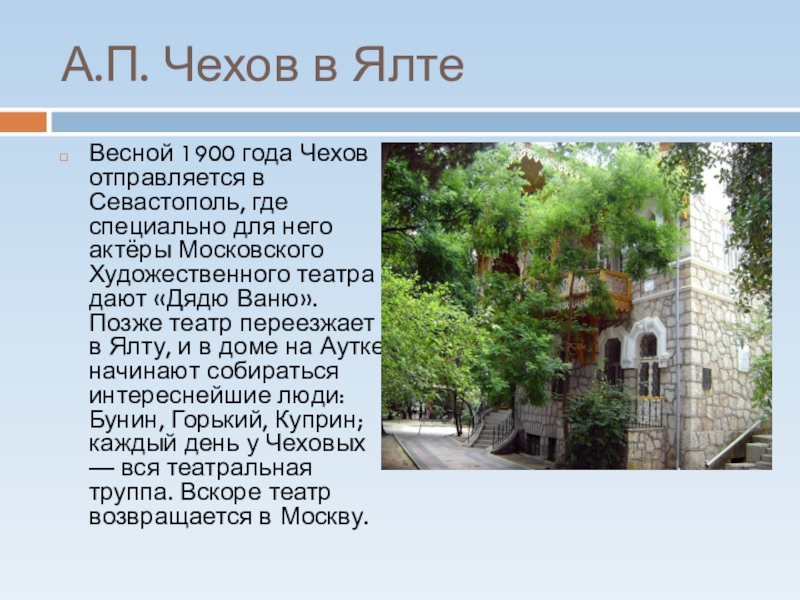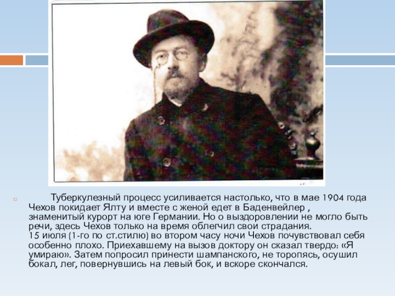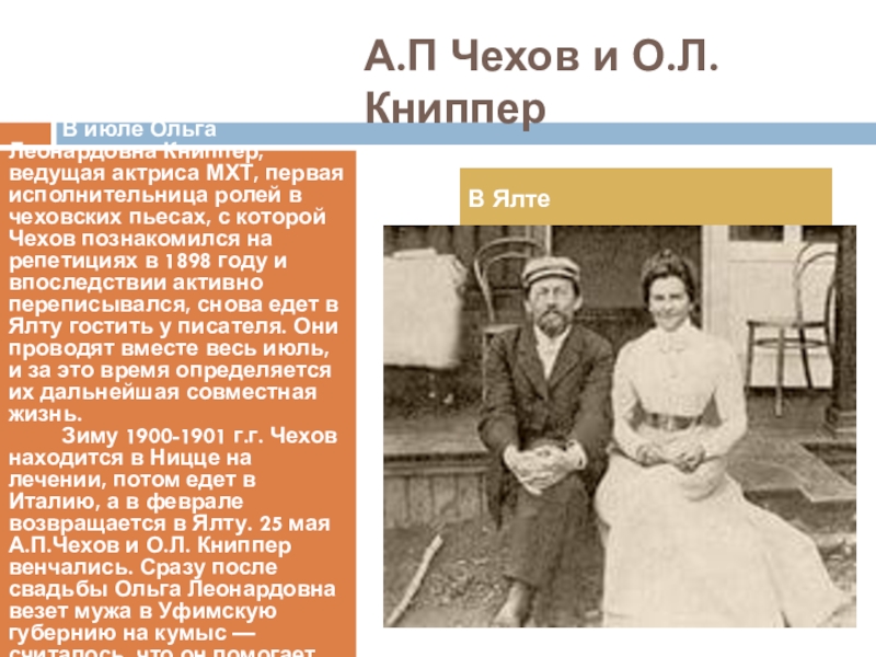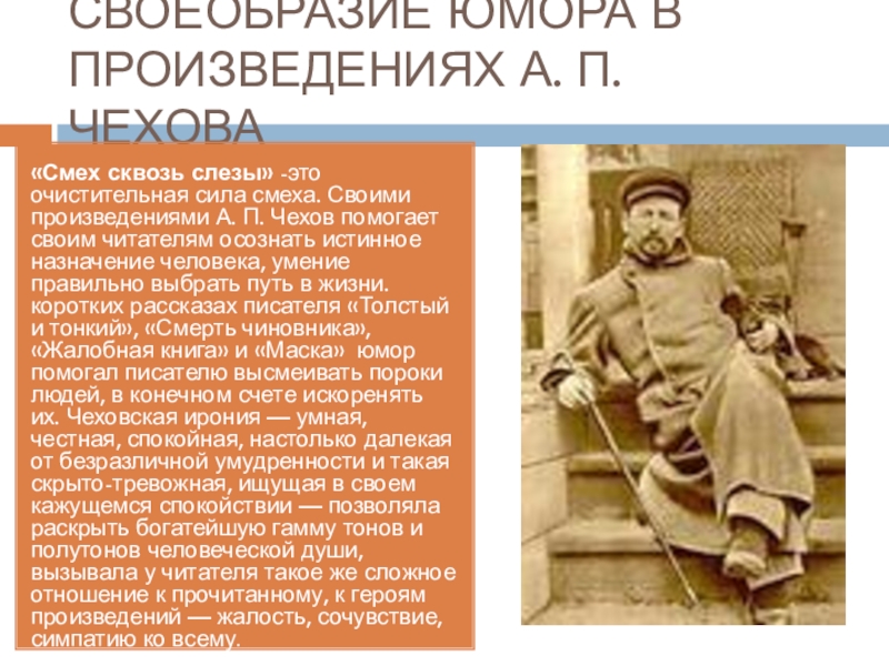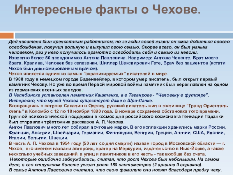 Интересные факты из жизни Чехова связаны с собаками. Как- то его друг Николай Лейкин подарил двух такс, к выбору имен которых Чехов подошел с юмором. Имена таксы получили от названия лекарственных препаратов Брома и Хины, а отчества по- своему окрасу. Черненькому Брому досталось отчество Исаевич, а рыженькой Хине – Марковна. Своими собаками Чехов очень дорожил, часто беседовал с ними, ласкал и играл, а иногда даже брал на рыбалку.