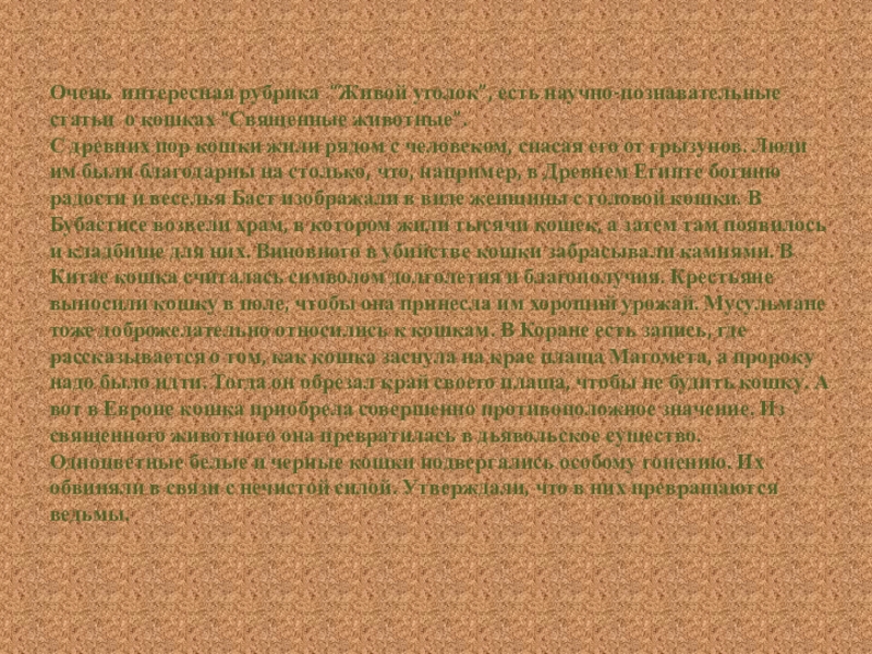Слайд 9Очень интересная рубрика “Живой уголок”, есть научно-познавательные статьи о кошках “Священные