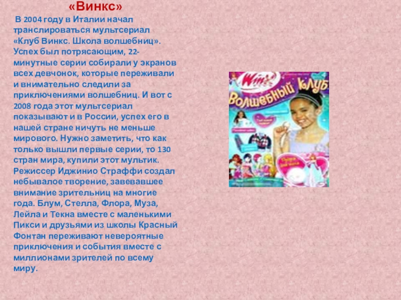 Школа волшебниц». Успех был потрясающим, 22-минутные серии собирали у экранов всех девчонок, которые переживали и внимательно следили за приключениями волшебниц. И вот с 2008 года этот мультсериал показывают и в России, успех его в нашей стране ничуть не меньше мирового. Нужно заметить, что как только вышли первые серии, то 130 стран мира, купили этот мультик. Режиссер Иджинио Страффи создал небывалое творение, завевавшее внимание зрительниц на многие года. Блум, Стелла, Флора, Муза, Лейла и Текна вместе с маленькими Пикси и друзьями из школы Красный Фонтан переживают невероятные приключения и события вместе с миллионами зрителей по всему миру.