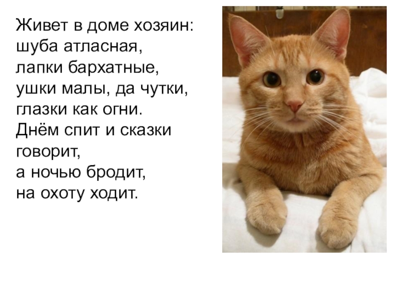 Живет в доме хозяин: шуба атласная, лапки бархатные, ушки малы, да чутки, глазки как огни. Днём спит и сказки говорит, а ночью бродит, на охоту ходит.