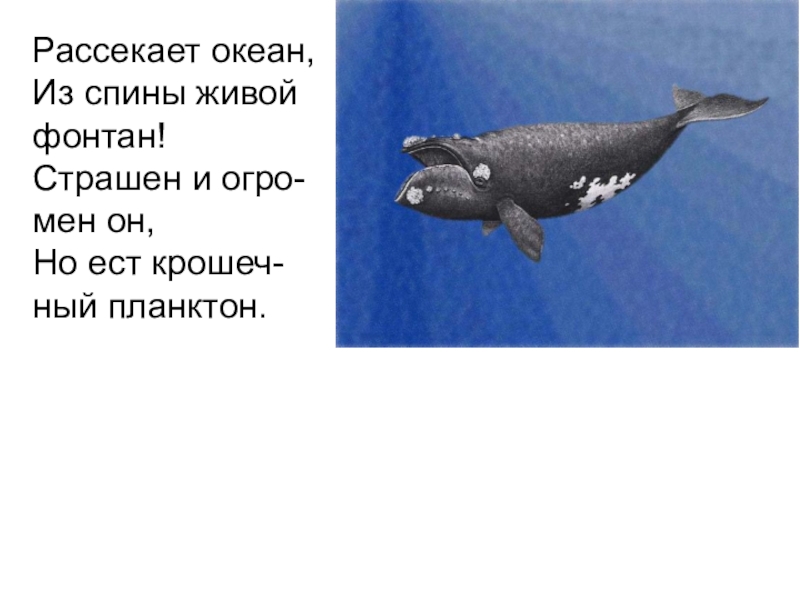 Рассекает океан, Из спины живой фонтан! Страшен и огро-мен он, Но ест крошеч-ный планктон.