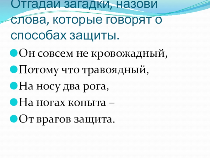 Отгадай загадки, назови слова, которые говорят о способах защиты.Он совсем не кровожадный,Потому что травоядный,На носу два рога,На