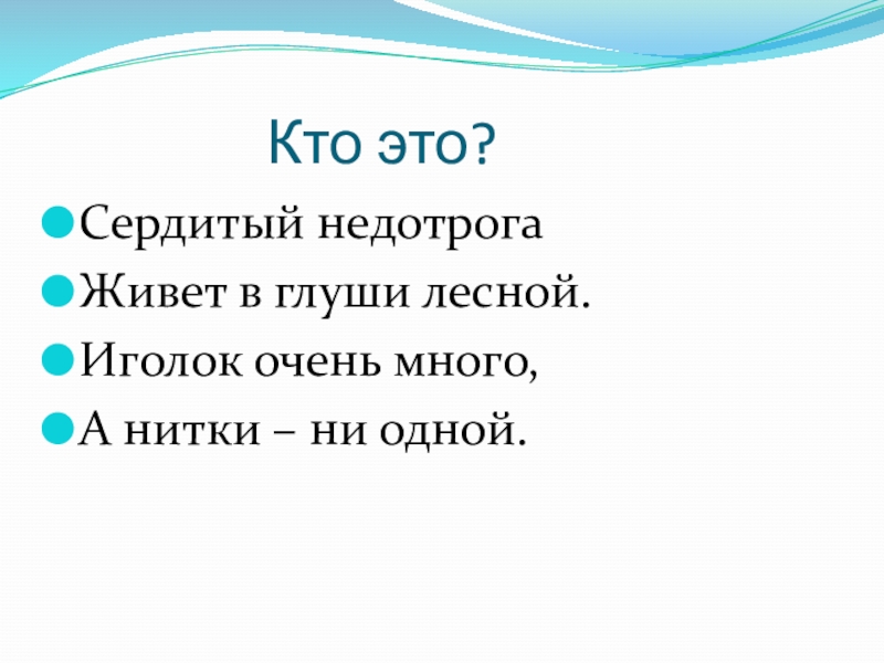 Кто это?Сердитый недотрогаЖивет в глуши лесной.Иголок очень много,А нитки