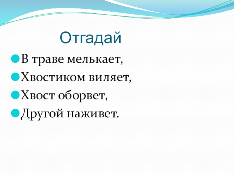 ОтгадайВ траве мелькает,Хвостиком виляет,Хвост оборвет, Другой наживет.