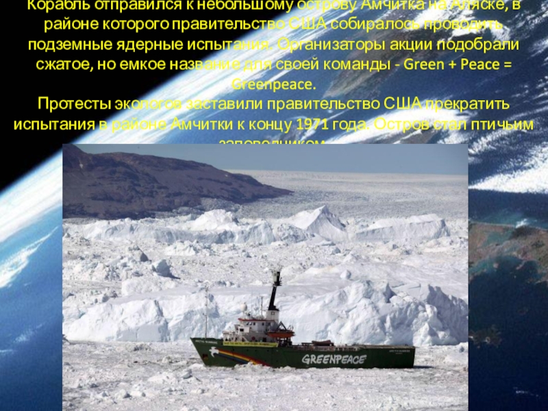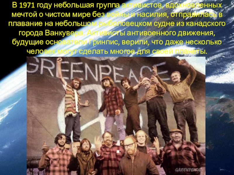 без войны и насилия, отправилась в плавание на небольшом рыболовецком судне из канадского города Ванкувера. Активисты антивоенного движения, будущие основатели Гринпис, верили, что даже несколько человек могут сделать многое для своей планеты.