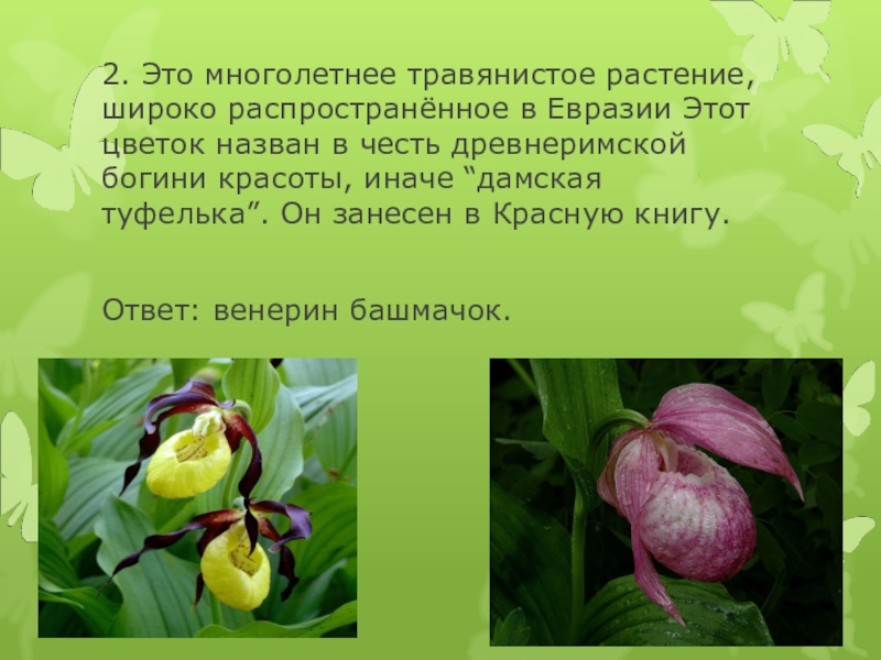 назван в честь древнеримской богини красоты, иначе “дамская туфелька”. Он занесен в Красную книгу.