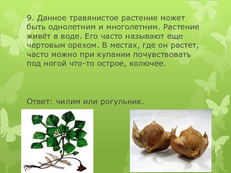 9. Данное травянистое растение может быть однолетним и многолетним. Растение живёт в воде. Его часто называют еще