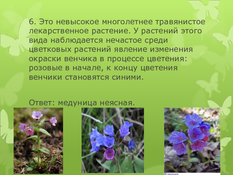6. Это невысокое многолетнее травянистое лекарственное растение. У растений этого вида наблюдается нечастое среди цветковых растений явление