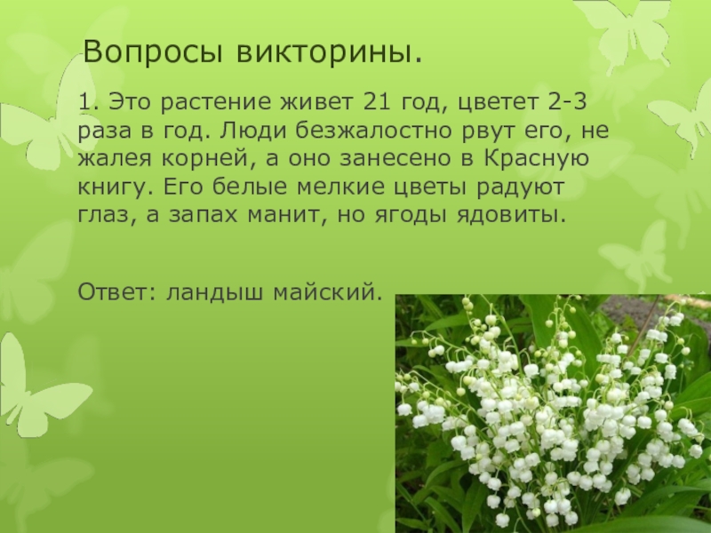 Вопросы викторины.1. Это растение живет 21 год, цветет 2-3 раза в год. Люди безжалостно рвут его, не