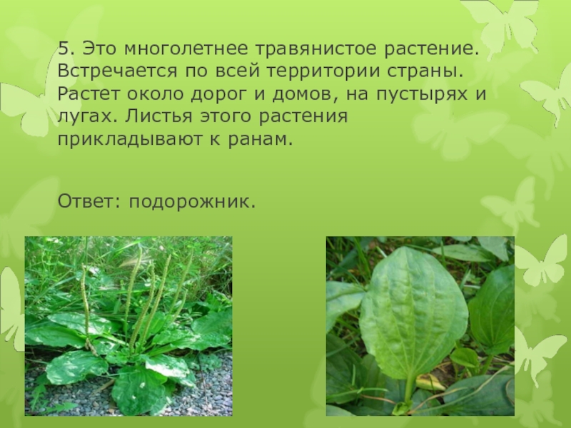 5. Это многолетнее травянистое растение. Встречается по всей территории страны. Растет около дорог и домов, на пустырях
