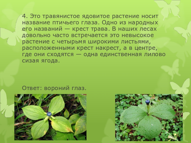 4. Это травянистое ядовитое растение носит название птичьего глаза. Одно из народных его названий — крест трава.