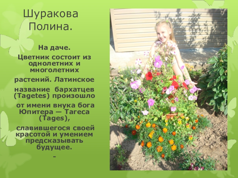 Шуракова Полина.На даче.Цветник состоит из однолетних и многолетнихрастений. Латинское название бархатцев (Tagetes) произошло от имени внука бога Юпитера — Тагеса (Tages), славившегося своей красотой и умением предсказывать будущее.-