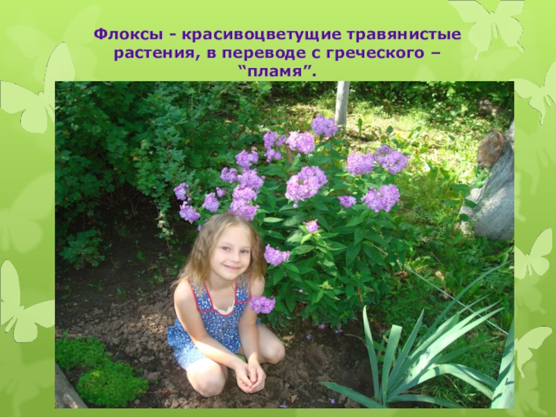 Слайд 3Флоксы - красивоцветущие травянистые растения, в переводе с греческого – “пламя”.