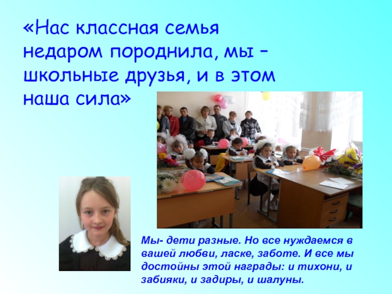 Мы- дети разные. Но все нуждаемся в вашей любви, ласке, заботе. И все мы достойны этой награды: и тихони, и забияки, и задиры, и шалуны.