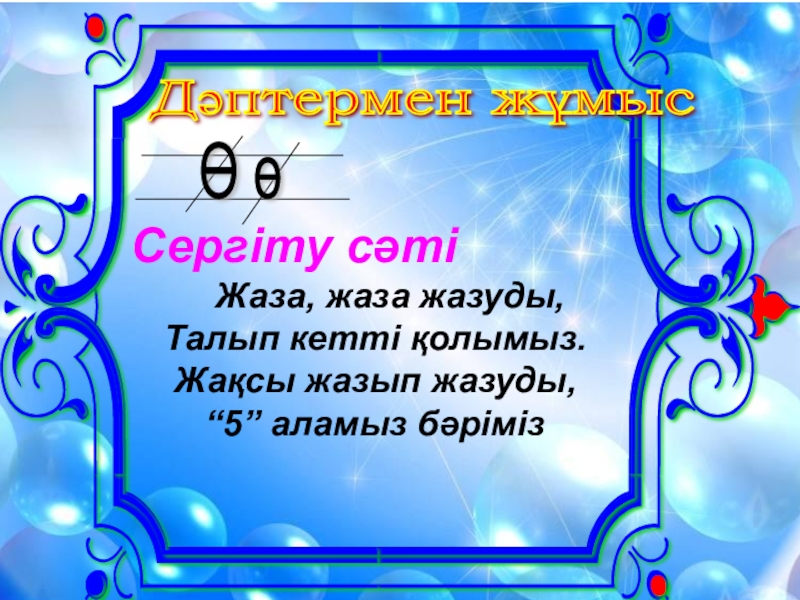 Дәптермен жұмыс Ө ө Сергіту сәті  Жаза, жаза жазуды,Талып кетті қолымыз.Жақсы жазып жазуды,“5” аламыз бәріміз