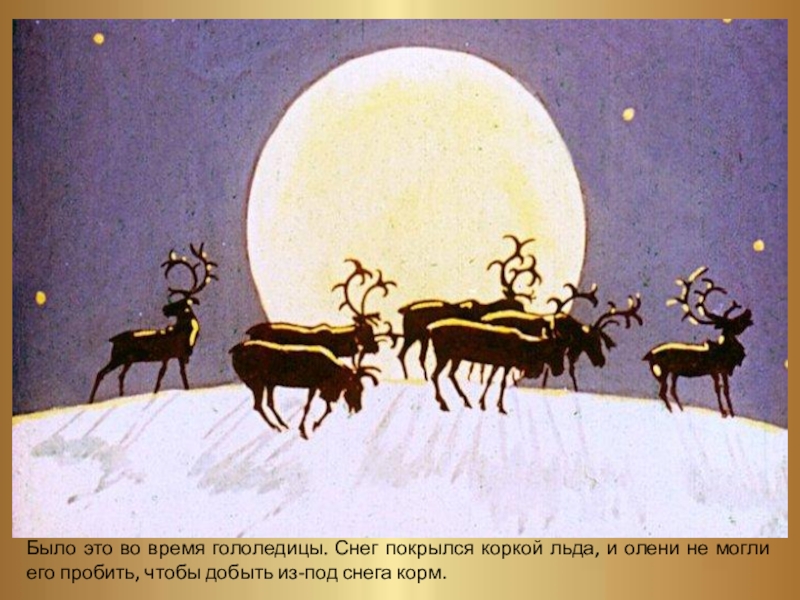 Слайд 28Было это во время гололедицы. Снег покрылся коркой льда, и олени