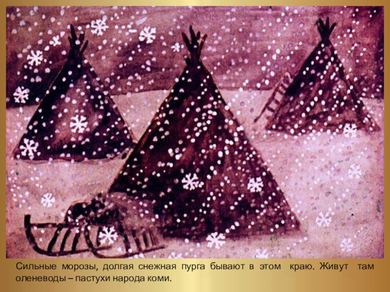 Сильные морозы, долгая снежная пурга бывают в этом краю. Живут там оленеводы – пастухи народа коми.