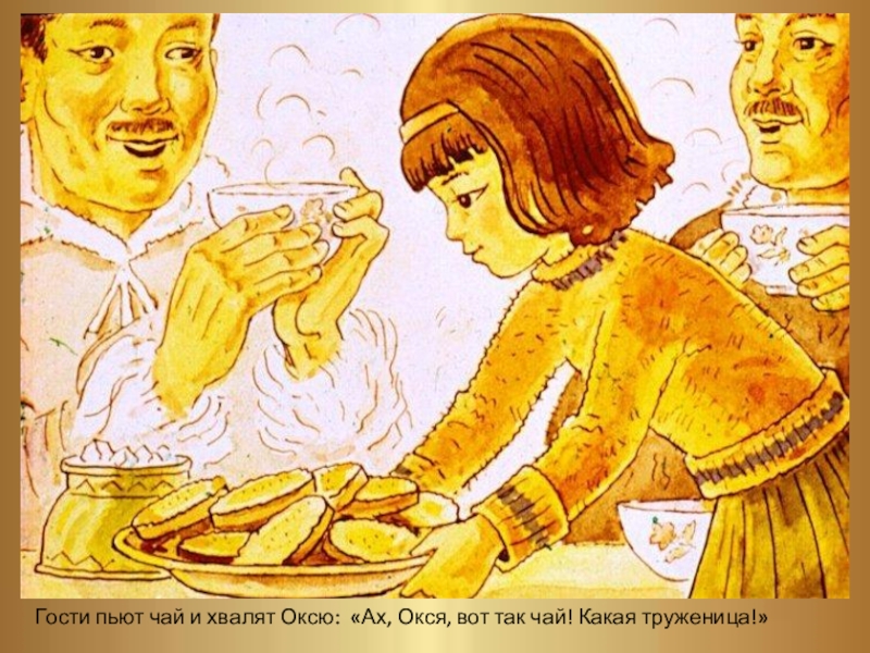 Слайд 26Гости пьют чай и хвалят Оксю: «Ах, Окся, вот так чай!