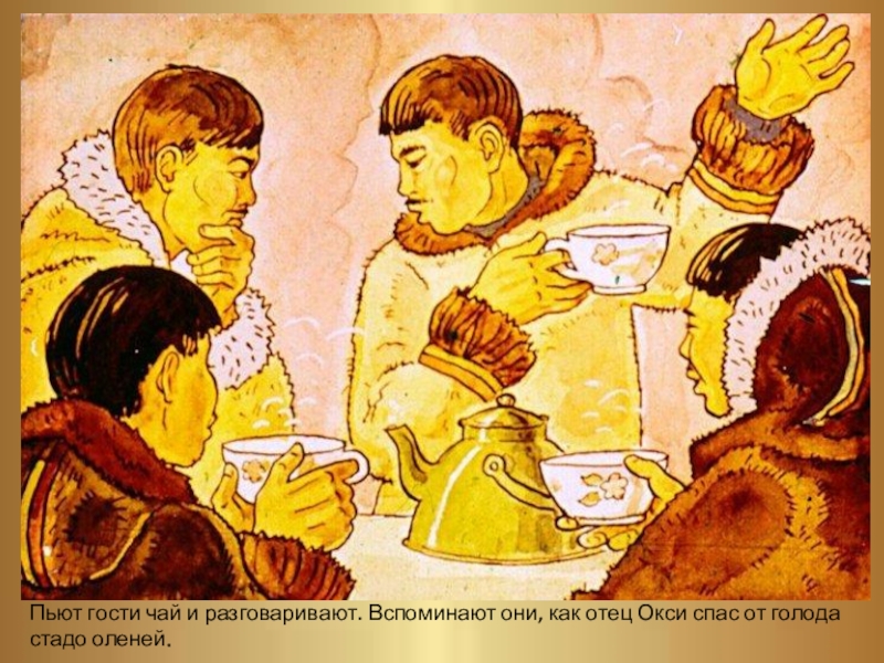 Пьют гости чай и разговаривают. Вспоминают они, как отец Окси спас от голода стадо оленей.