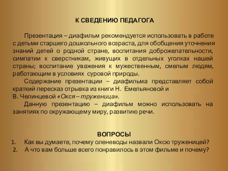 К СВЕДЕНИЮ ПЕДАГОГА	Презентация – диафильм рекомендуется использовать в работе с детьми старшего дошкольного возраста, для обобщения