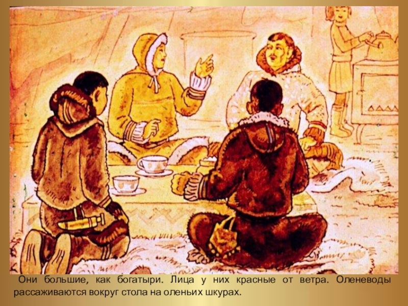Они большие, как богатыри. Лица у них красные от ветра. Оленеводы рассаживаются вокруг стола на оленьих