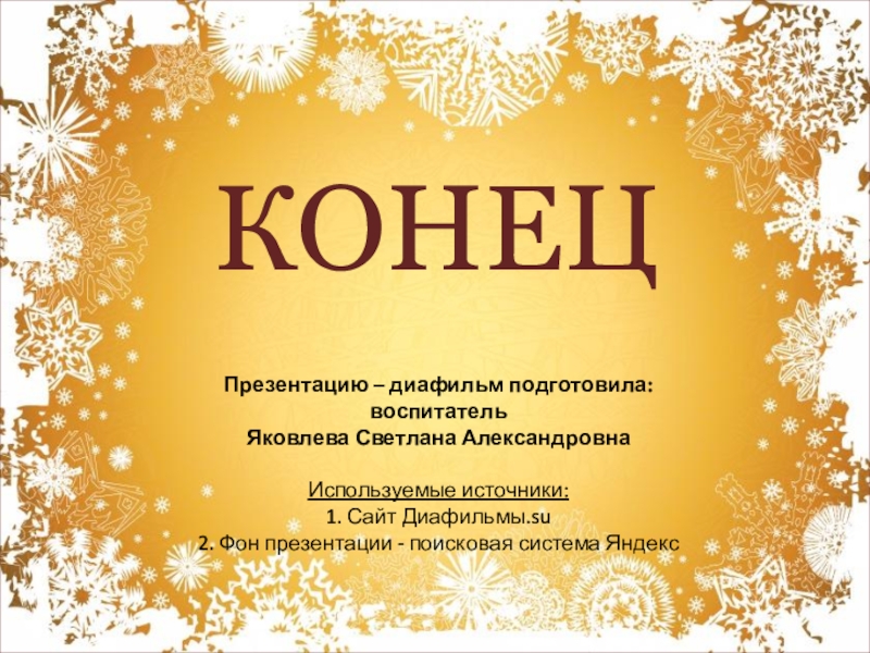 КОНЕЦПрезентацию – диафильм подготовила: воспитательЯковлева Светлана АлександровнаИспользуемые источники:1. Сайт Диафильмы.su2. Фон презентации - поисковая система Яндекс