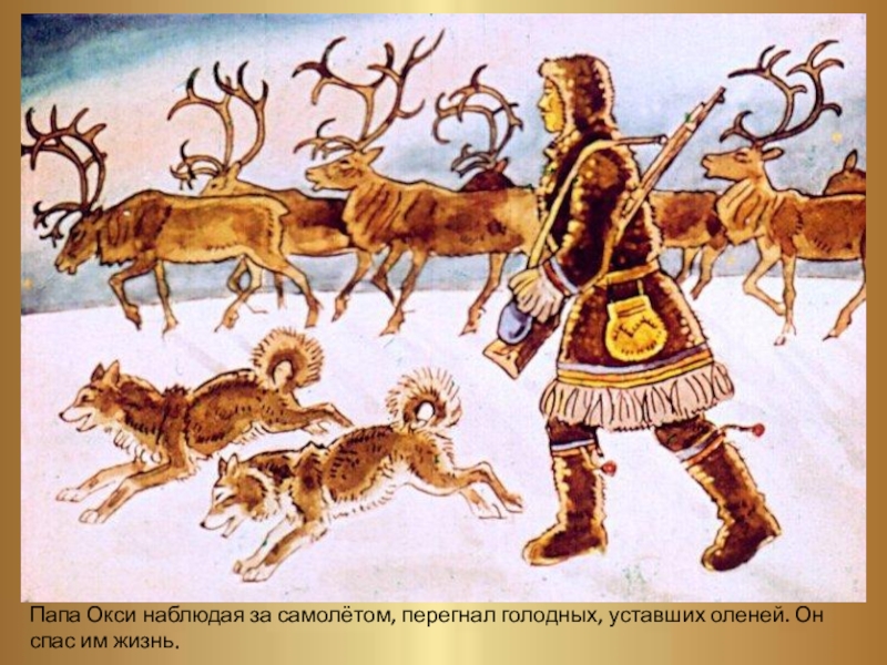 Слайд 30Папа Окси наблюдая за самолётом, перегнал голодных, уставших оленей. Он спас