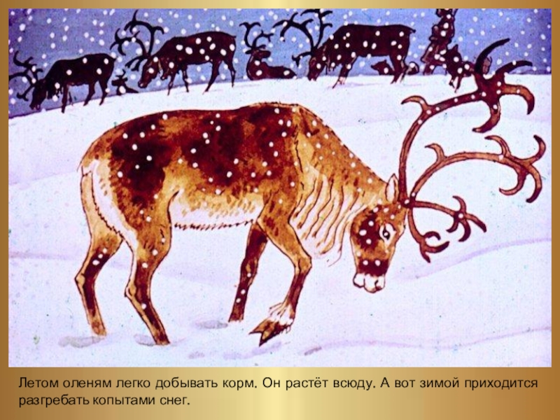 Слайд 12Летом оленям легко добывать корм. Он растёт всюду. А вот зимой