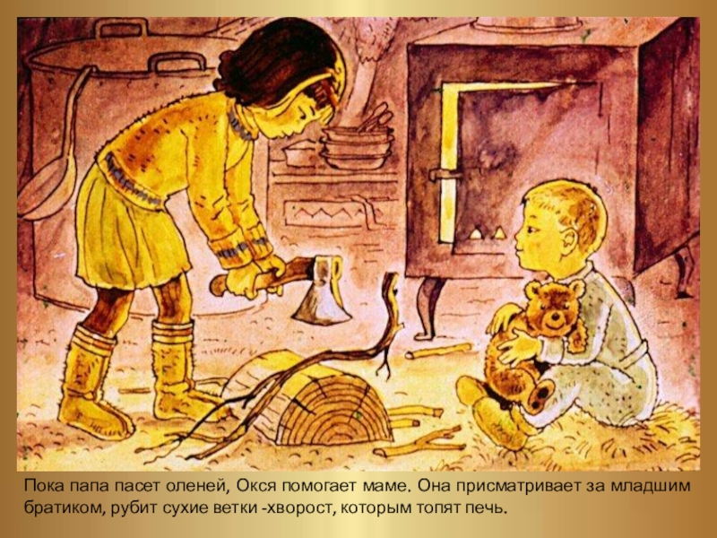 Пока папа пасет оленей, Окся помогает маме. Она присматривает за младшим братиком, рубит сухие ветки -хворост, которым