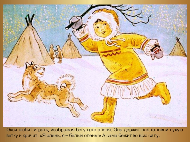 Слайд 20Окся любит играть, изображая бегущего оленя. Она держит над головой сухую