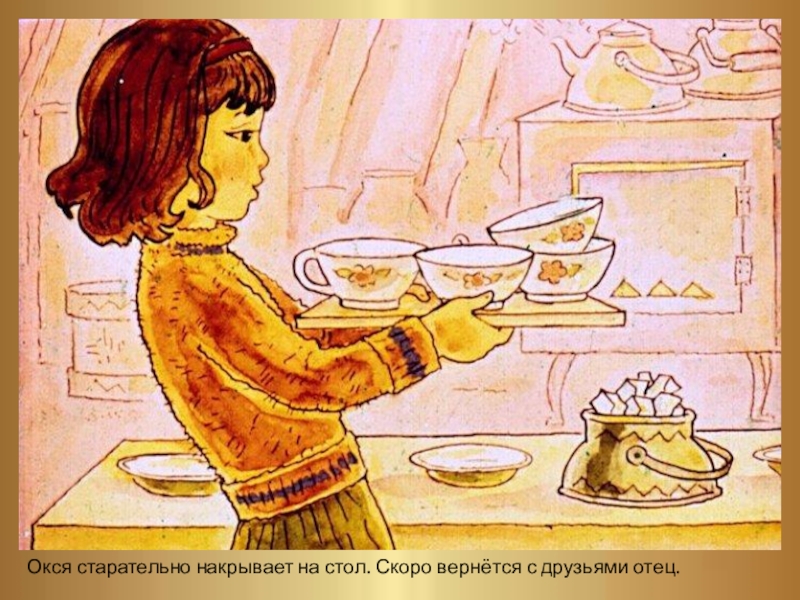 Слайд 23Окся старательно накрывает на стол. Скоро вернётся с друзьями отец.
