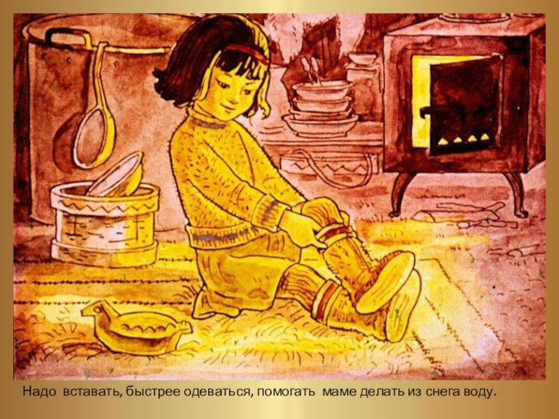 Слайд 5Надо вставать, быстрее одеваться, помогать маме делать из снега воду.