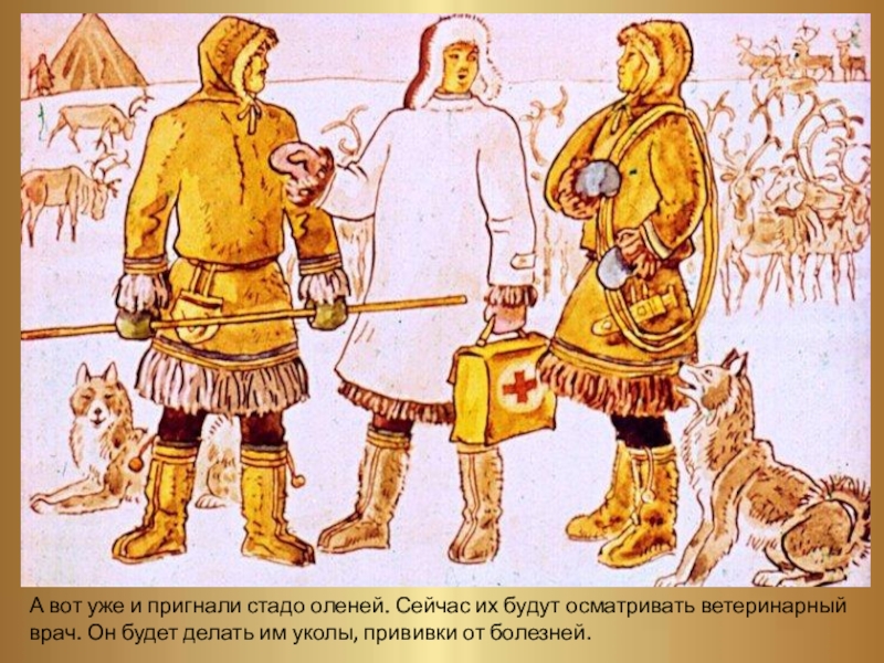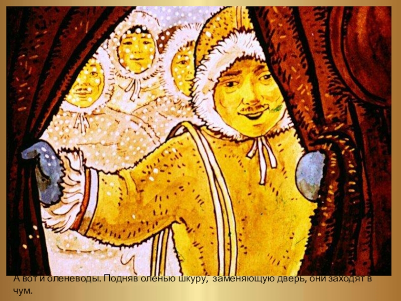 Слайд 24А вот и оленеводы. Подняв оленью шкуру, заменяющую дверь, они заходят