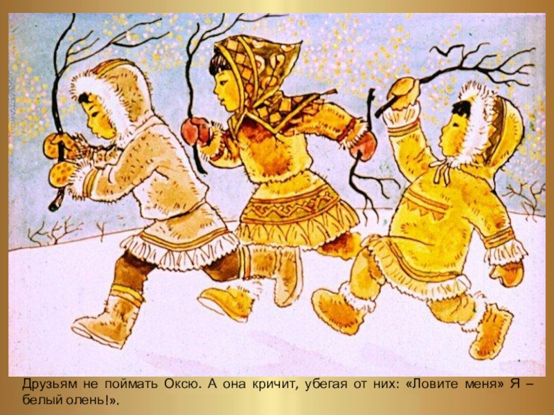 Друзьям не поймать Оксю. А она кричит, убегая от них: «Ловите меня» Я – белый олень!».