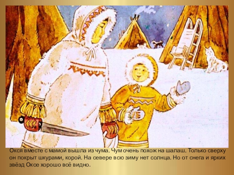 Слайд 4Проснулась Окся, в чуме темно. Может быть, ещё ночь и