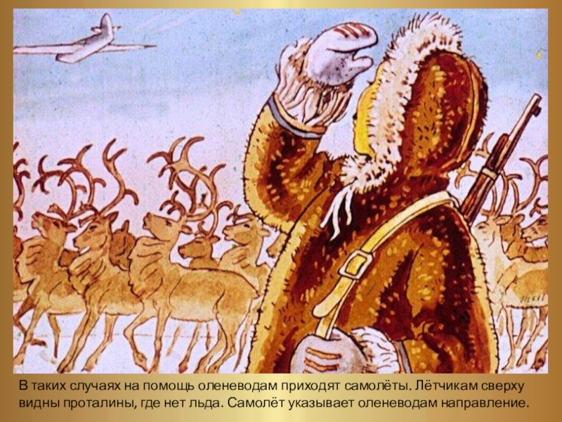 Слайд 29В таких случаях на помощь оленеводам приходят самолёты. Лётчикам сверху видны