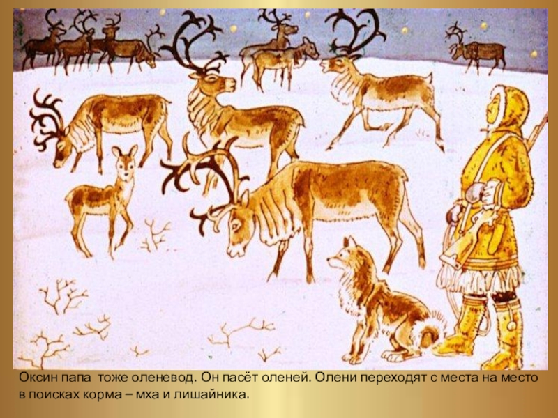 Слайд 11Оксин папа тоже оленевод. Он пасёт оленей. Олени переходят с места