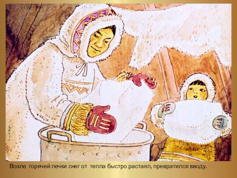 Слайд 8Возле горячей печки снег от тепла быстро растаял, превратился вводу.