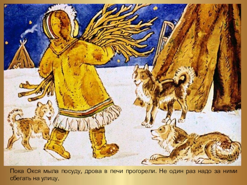 Слайд 17Пока Окся мыла посуду, дрова в печи прогорели. Не один раз