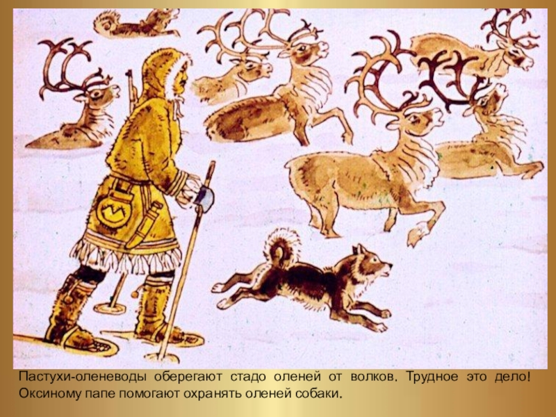 Слайд 13Пастухи-оленеводы оберегают стадо оленей от волков. Трудное это дело! Оксиному папе