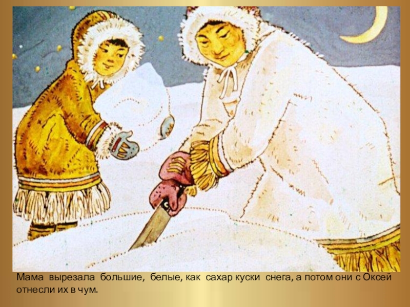 Мама вырезала большие, белые, как сахар куски снега, а потом они с Оксей отнесли их в чум.