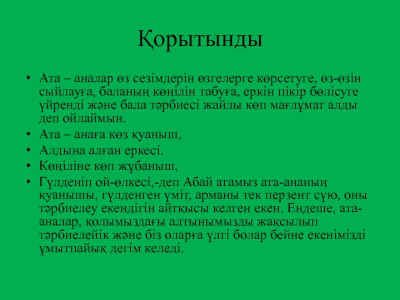 Гүлденіп ой-өлкесі,-деп Абай атамыз ата-ананың қуанышы, гүлденген үміт, арманы тек перзент сүю, оны тәрбиелеу екендігін айтқысы келген екен. Ендеше, ата-аналар, қолымыздағы алтынымызды жақсылып тәрбиелейік және біз оларға үлгі болар бейне екенімізді ұмытпайық дегім келеді.