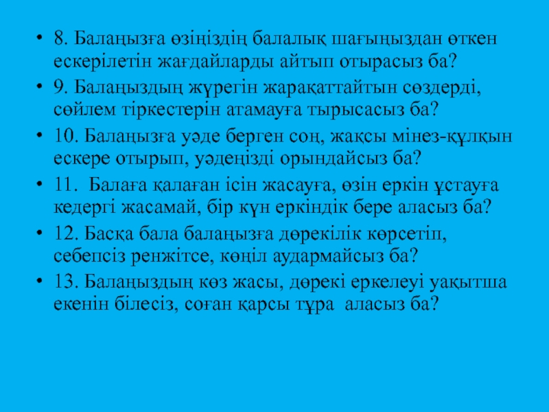 Слайд 168. Балаңызға өзіңіздің балалық шағыңыздан өткен ескерілетін жағдайларды айтып отырасыз ба?